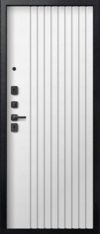 Надежная входная Дверь V-15 Черный муар + Бетон темный - Софт ясень белый премиум класса по цене 43 535 руб. Большая толщина стали защитит от проникновения в ваш дом, квартиру или коттедж. Используется очень качественная фурнитура: замки, цилиндры, ручки, защелки. Покрытие и отделка двери изготовлено под внимательным контролем производителя. Дверь имеет долгий срок службы и гарантию.